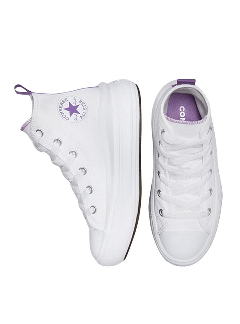Sapatilhas Converse. Modelo Chuck Taylor Move. Cor branca. Plataforma com volume. Fecho com cordões. Logotipo lateral. Detalhes em cor lilás. Biqueira de borracha.