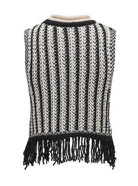 Top Only. Modelo Laina. Cor preta e branca. Sem mangas. Gola redonda. Tecido estilo étnico. Corte cropped. Barra com franjas.