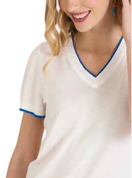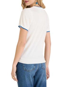 Camiseta Naf Naf. Modelo de malha branca. Decote em V. Mangas curtas. Ajuste regular. Extremidades caneladas. Detalhe em azul no decote e mangas.