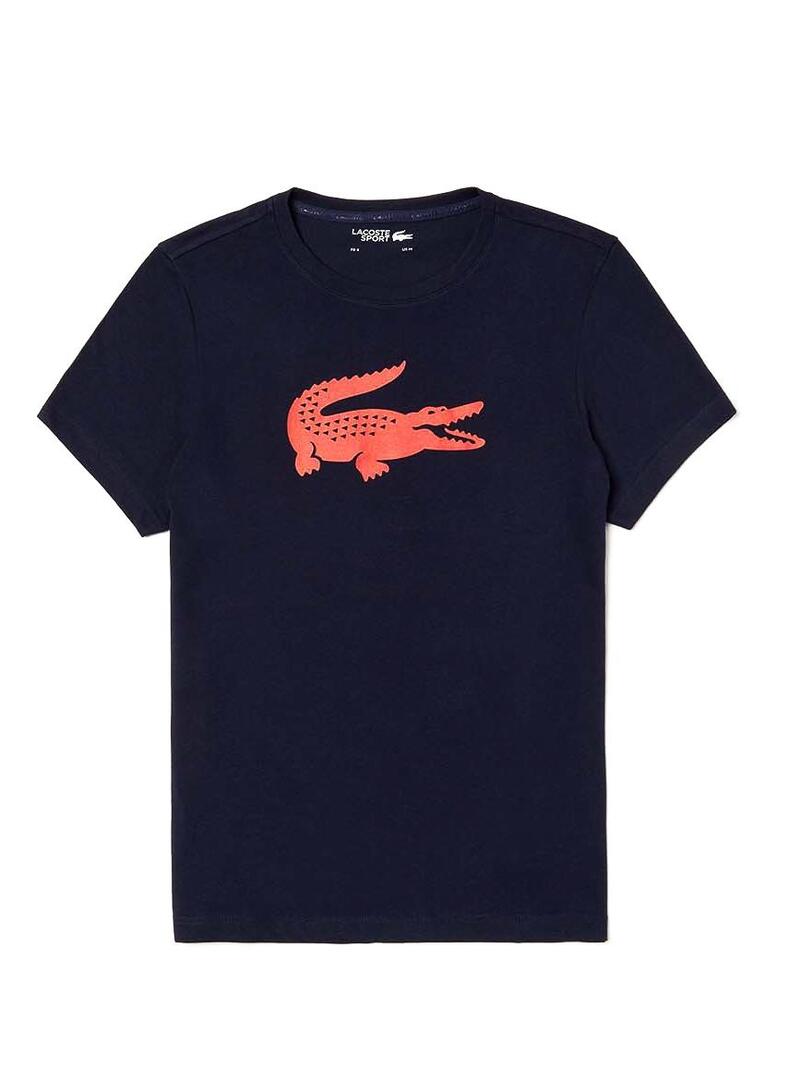 T-Shirt Lacoste Sport. Modelo Croco Oversized. Cor marinha. Decote redondo. Manga curta. Crocodilo vermelho extra grande no peito Tecido ultra-seco. Etiqueta Lacoste no pescoço interior. O modelo está usando tamanho 4.