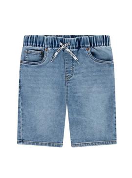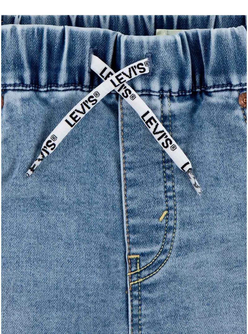 Bermuda Levis. Tecido denim lavado médio. Formato skinny. Cintura elástica com cordões estampados. Corte ajustado. 5 bolsos. Comprimento até o joelho.