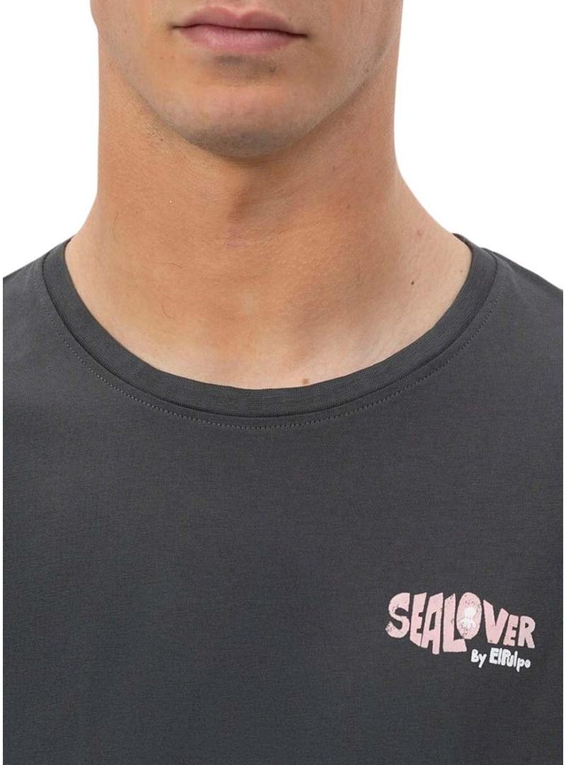 Camiseta El Pulpo. Manga curta. Cor cinza. Gola redonda. Tecido orgânico. Estampa Sealover no peito e nas costas. Etiqueta Sealover Routine costurada na parte inferior. Formato regular.