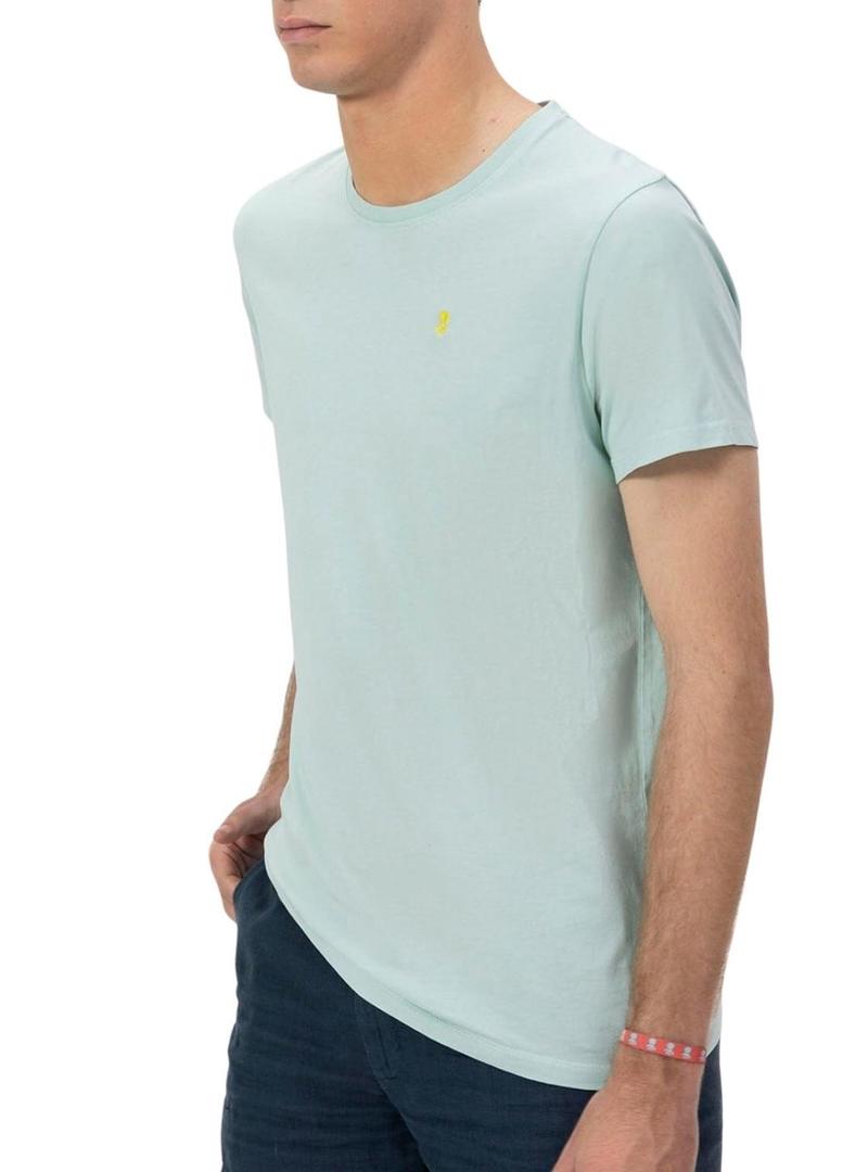 Camiseta El Pulpo. Cor turquesa. Manga curta. Logo da marca amarelo bordado no peito. Gola redonda. Três cruzes amarelas bordadas na manga. Ajuste regular.