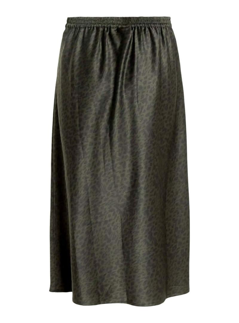 Saia Vila. Cor verde. Estampa de leopardo. Cintura de elástico. Tecido acetinado. Formato midi. O modelo está vestindo o tamanho 36.