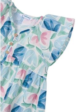 Vestido Mayoral. Estampado de flores. Cor azul, verde, branco e rosa. Decote em V. Fechamento com botões. Babados nas mangas. Tecido fluido.