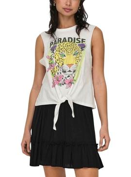 Camisa Only. Gola redonda. Sem mangas. Detalhe de nó na parte inferior. Corte regular. Estampa na parte da frente. Cor branca. A modelo veste o tamanho S.