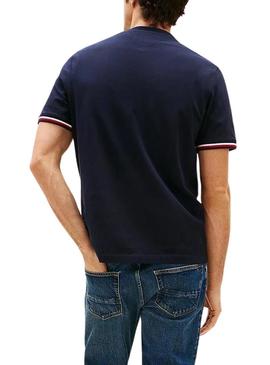 Camiseta Tommy Hilfiger. Modelo Global Stripe. Cor azul marinho. Gola redonda. Ajuste regular. Manga curta. Extremidades da manga com faixa vermelha e branca.