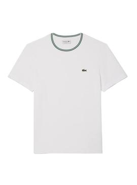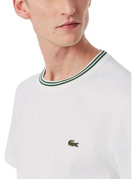 Camiseta Lacoste. Cor branca. Gola redonda com banda em verde. Manga curta. Ajuste regular. Crocodilo bordado no peito.