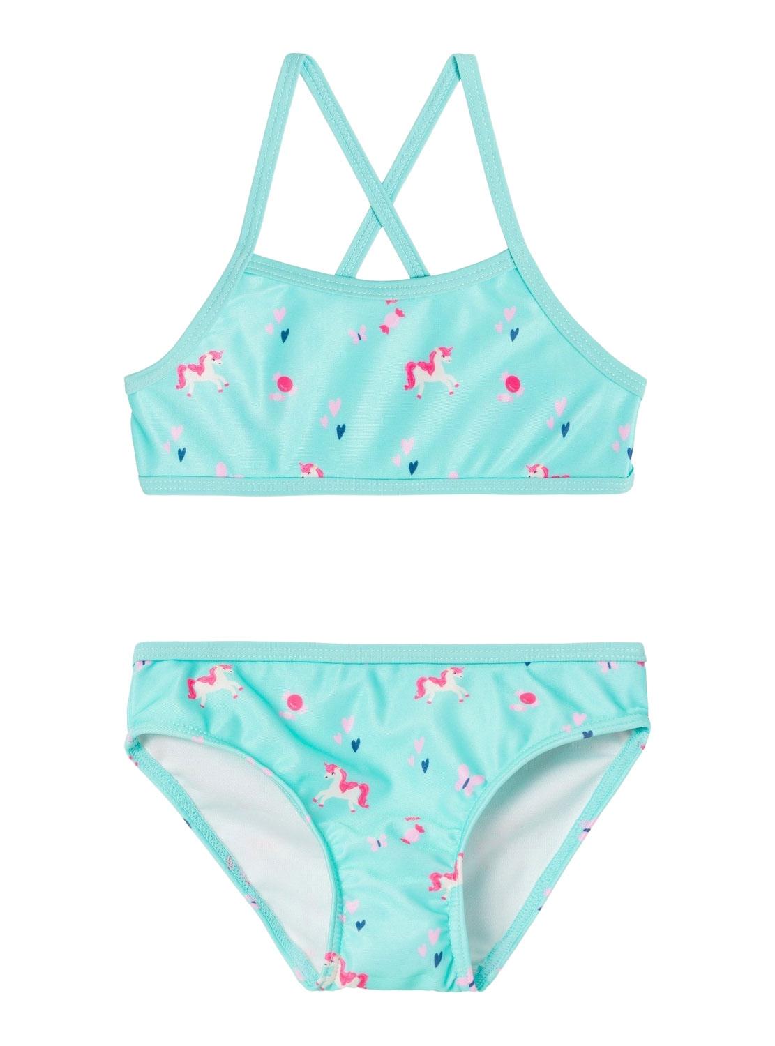 Fato de banho Name It. Modelo Zeria. Estampa de leopardo integral. Tecido elástico de poliamida e elastano. Fato de banho para menina. Forro interior de poliéster. Detalhes com brilhos.
