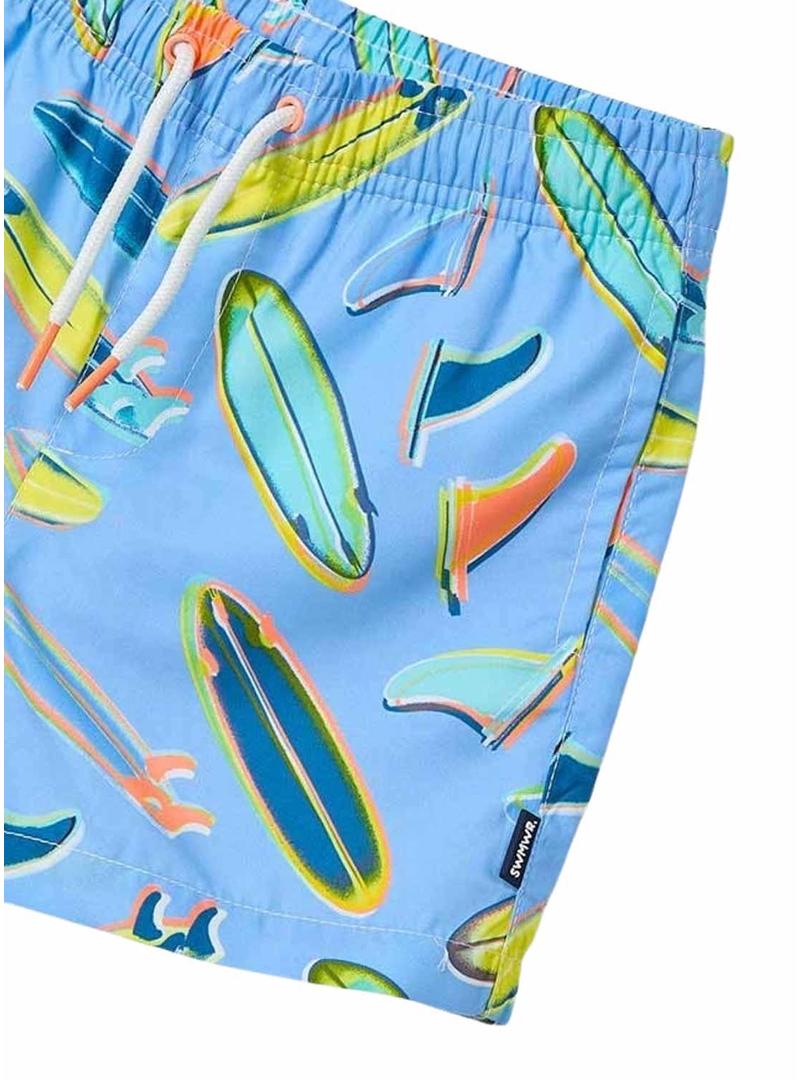 Swimsuit Mayoral. Estampado com pranchas de surf. Cor azul. Cintura de elástico com cordão. Bolsos laterais. Bolso traseiro.