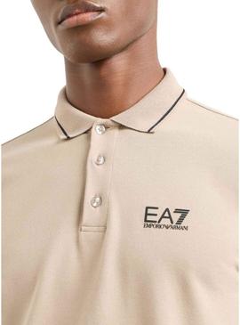 Polo Emporio Armani EA7. Cor bege. Estilo básico. Logotipo estampado no peito. Gola com faixa em preto. Fechamento com três botões. Corte ajustado. Tecido elástico.