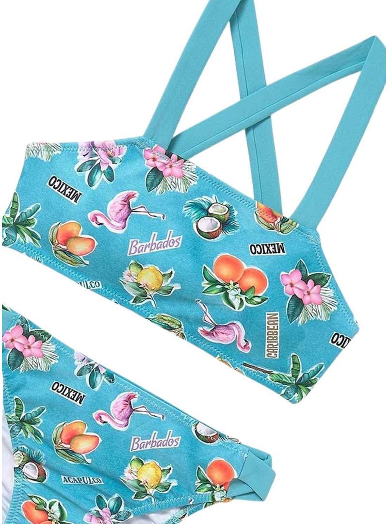 Biquíni Mayoral. Estampado tropical. Cor azul-turquesa. Parte superior com alças cruzadas.