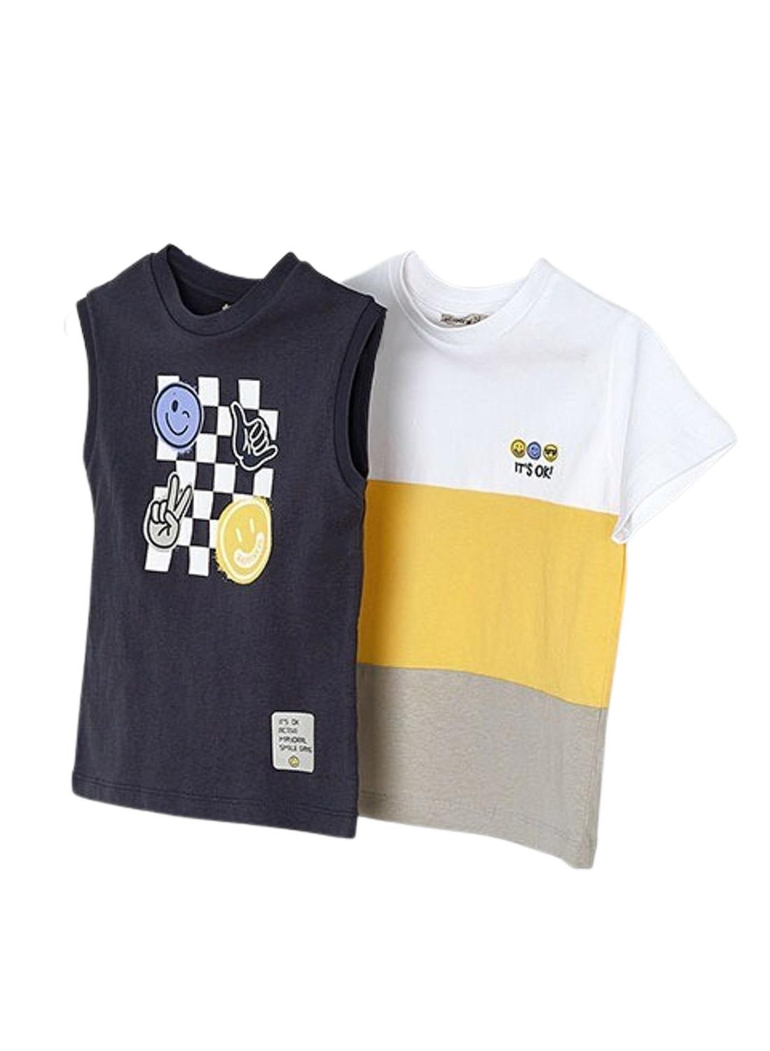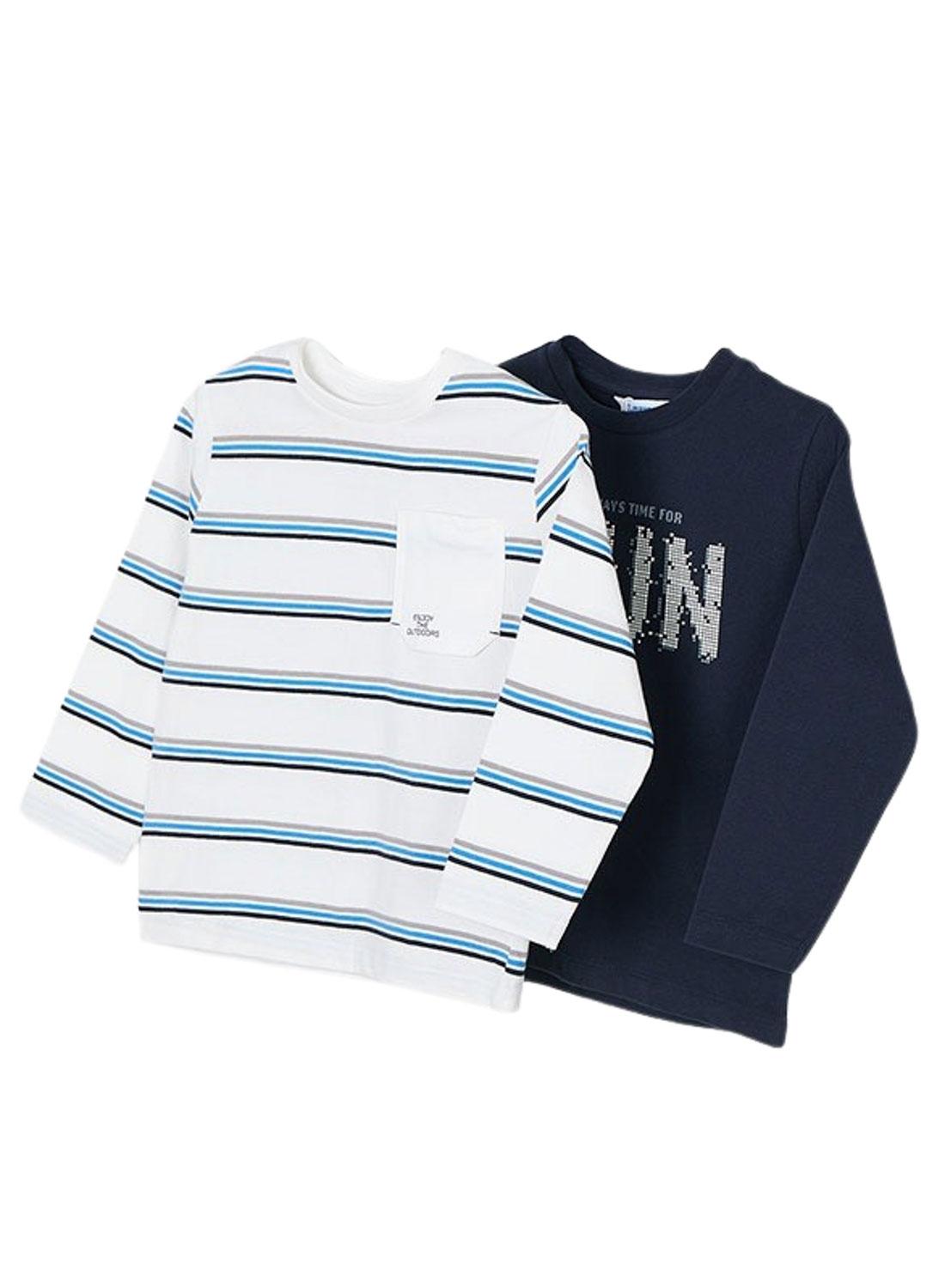 Conjunto de 2 camisetas Mayoral branca e azul marinho para menino.