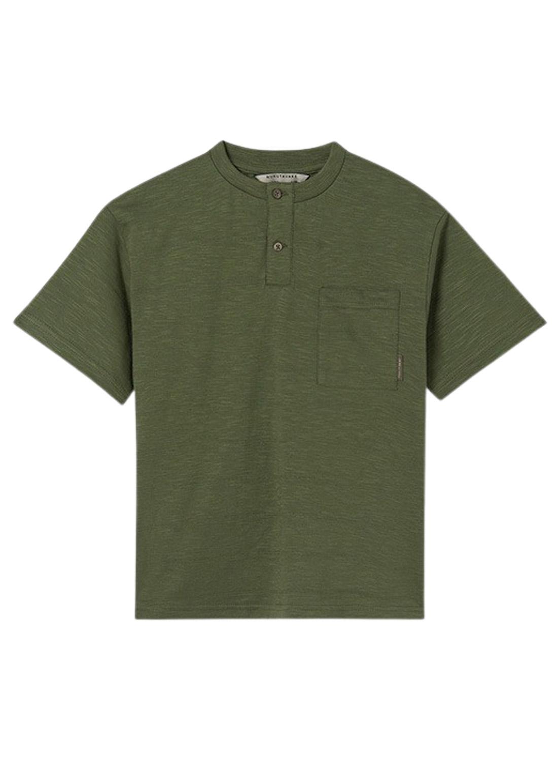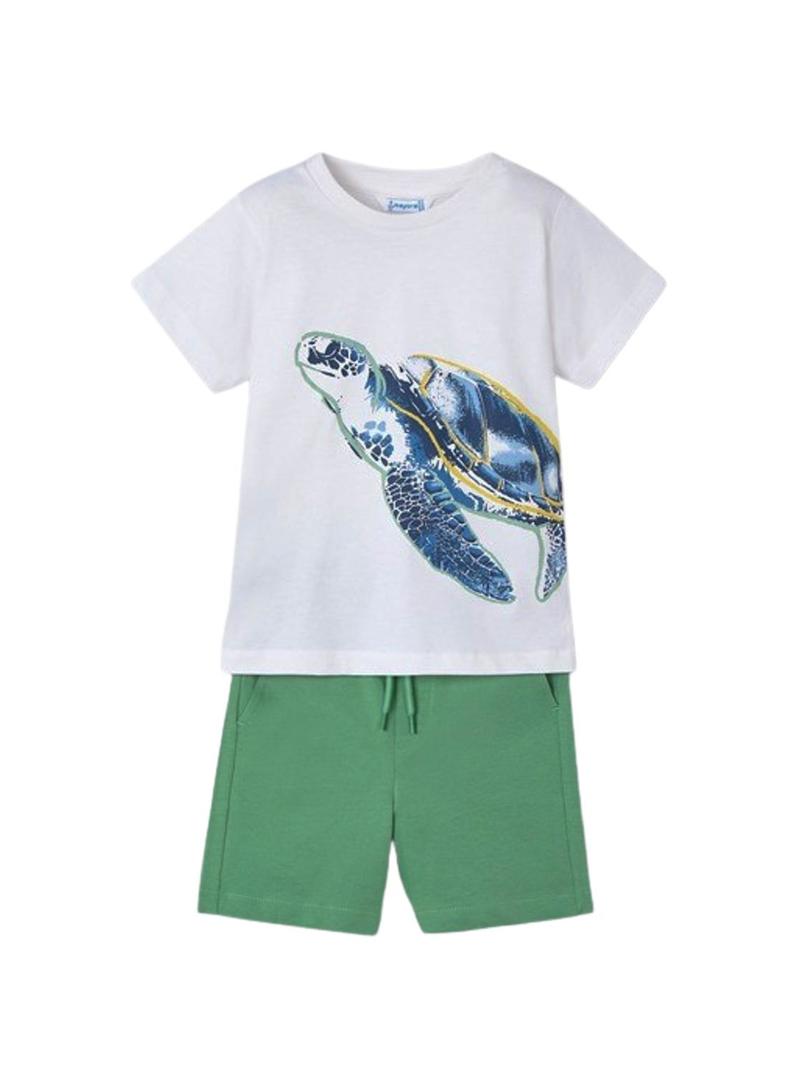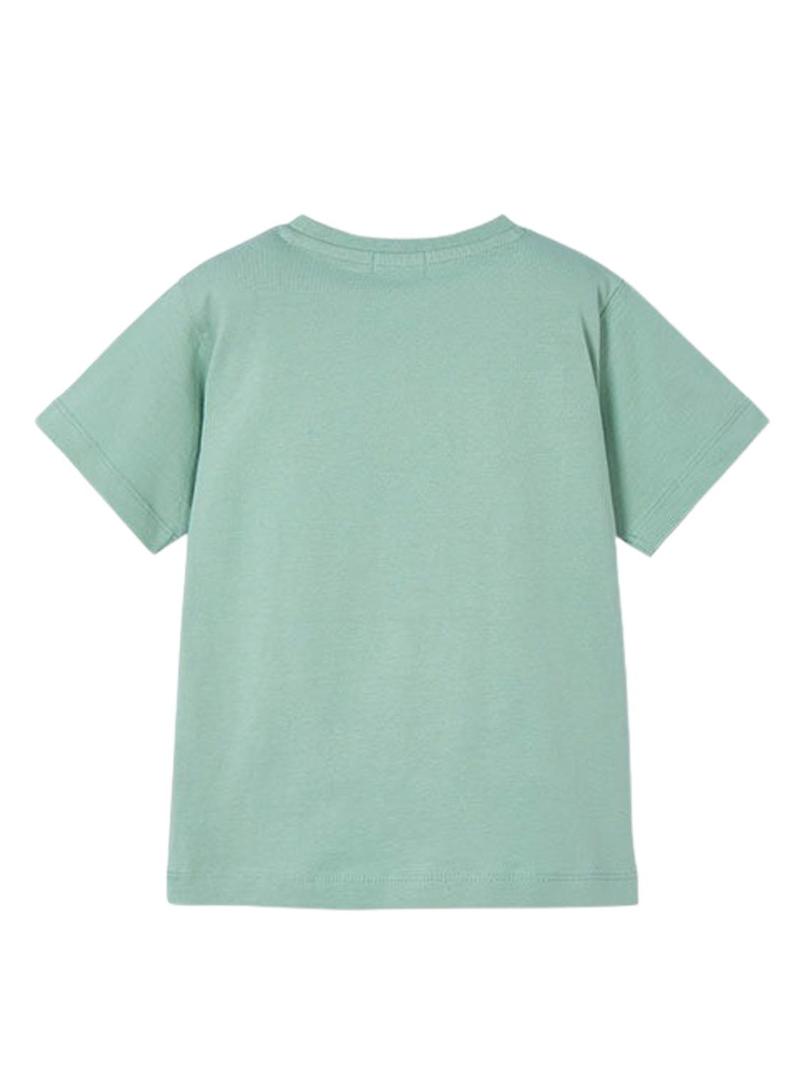 Set Mayoral. Camiseta verde. Manga curta. Gola redonda. Mensagem estampada no peito. Bermuda azul marinho. Bolsos laterais com zíper. Cintura elástica com cordão.