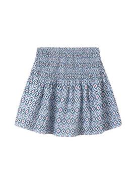Saia Mayoral. Cor azul. Estampada. Cintura de elástico largo. Formato curto.