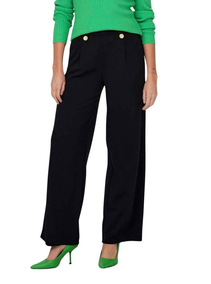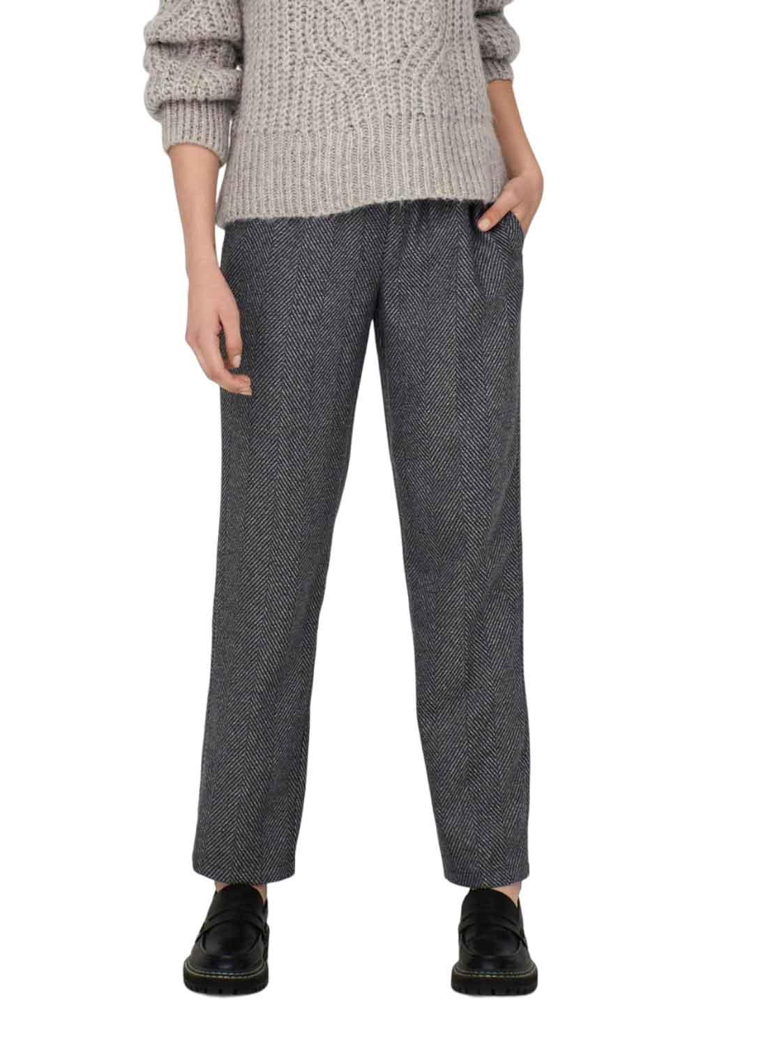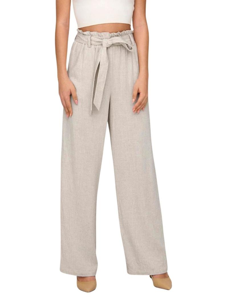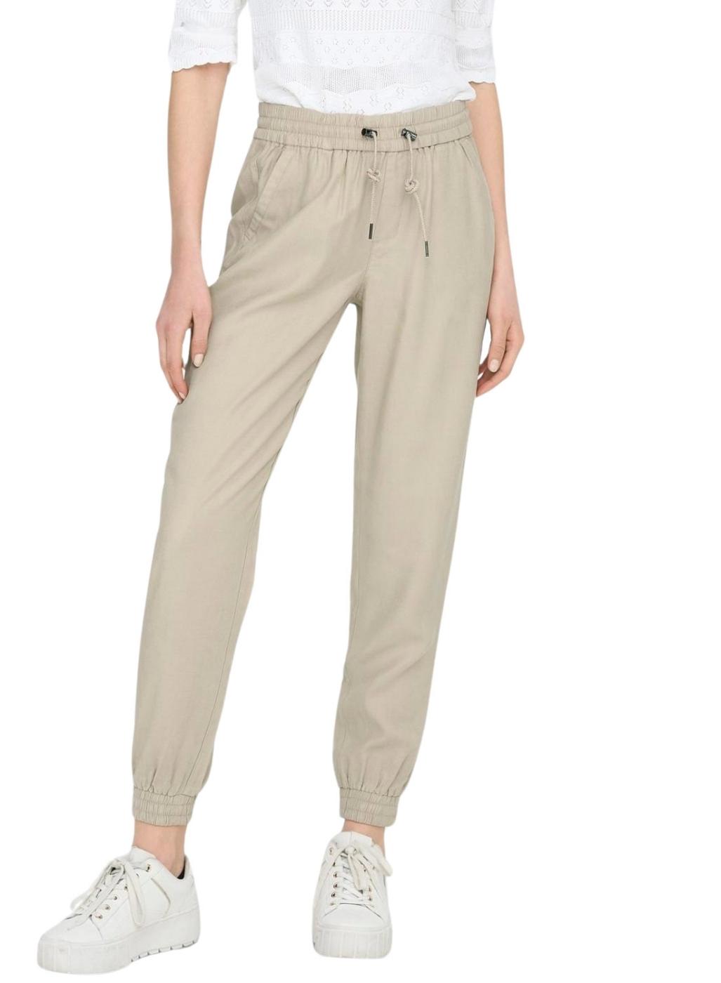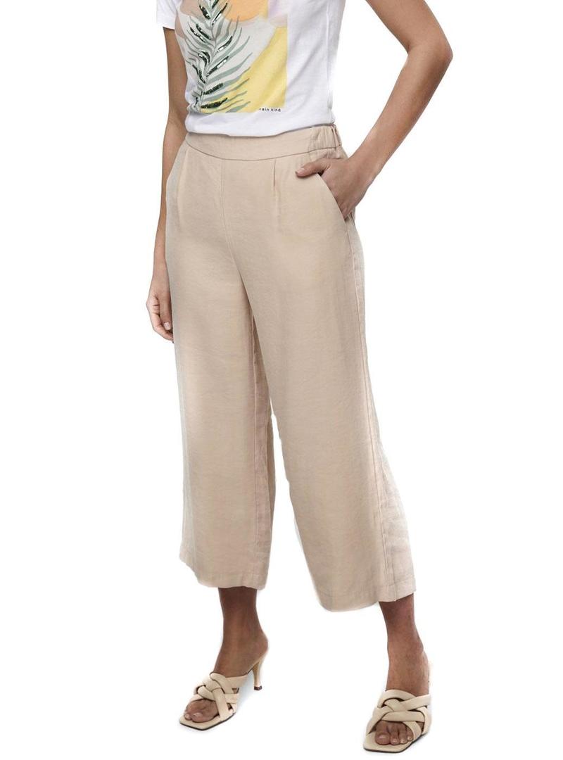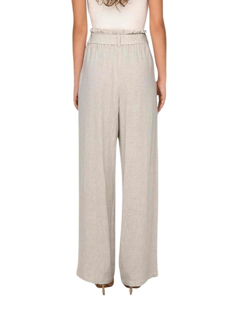 Calças Only. Cor azul. Tecido leve. Formato comprido. Cintura alta com elástico. Corte folgado. Perna larga. Bolsos laterais. O modelo veste o tamanho S.