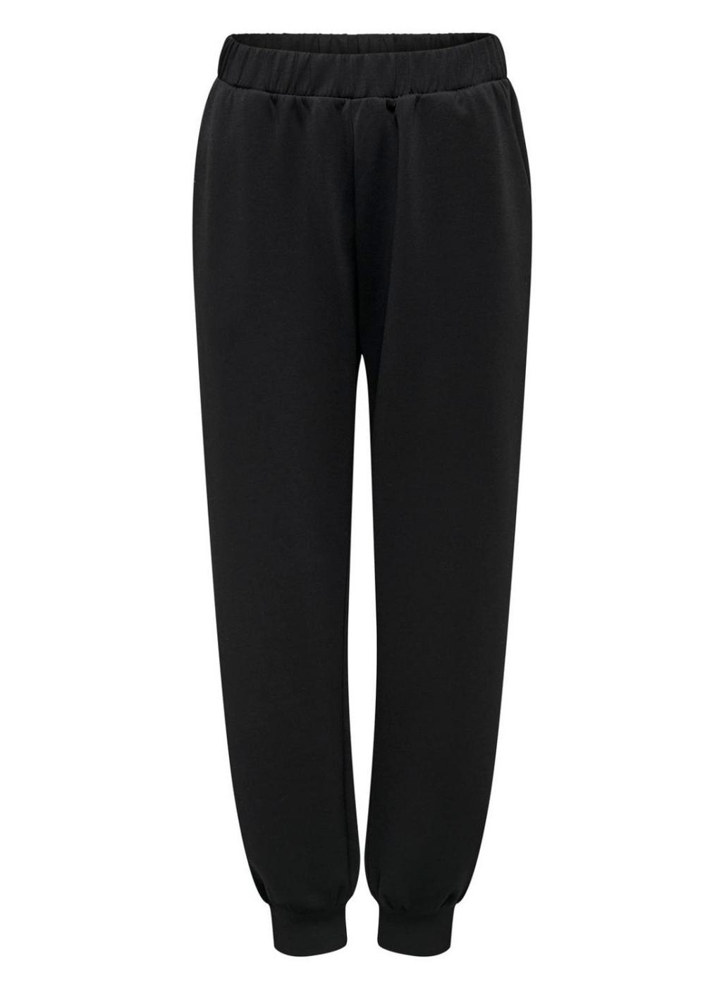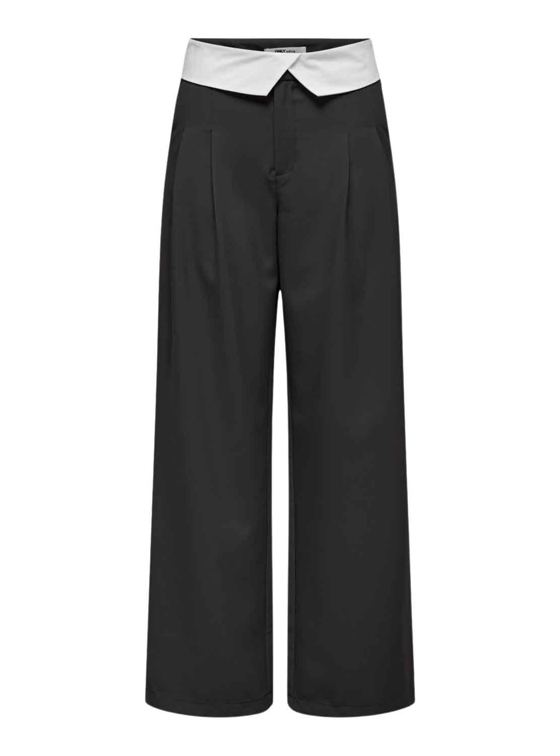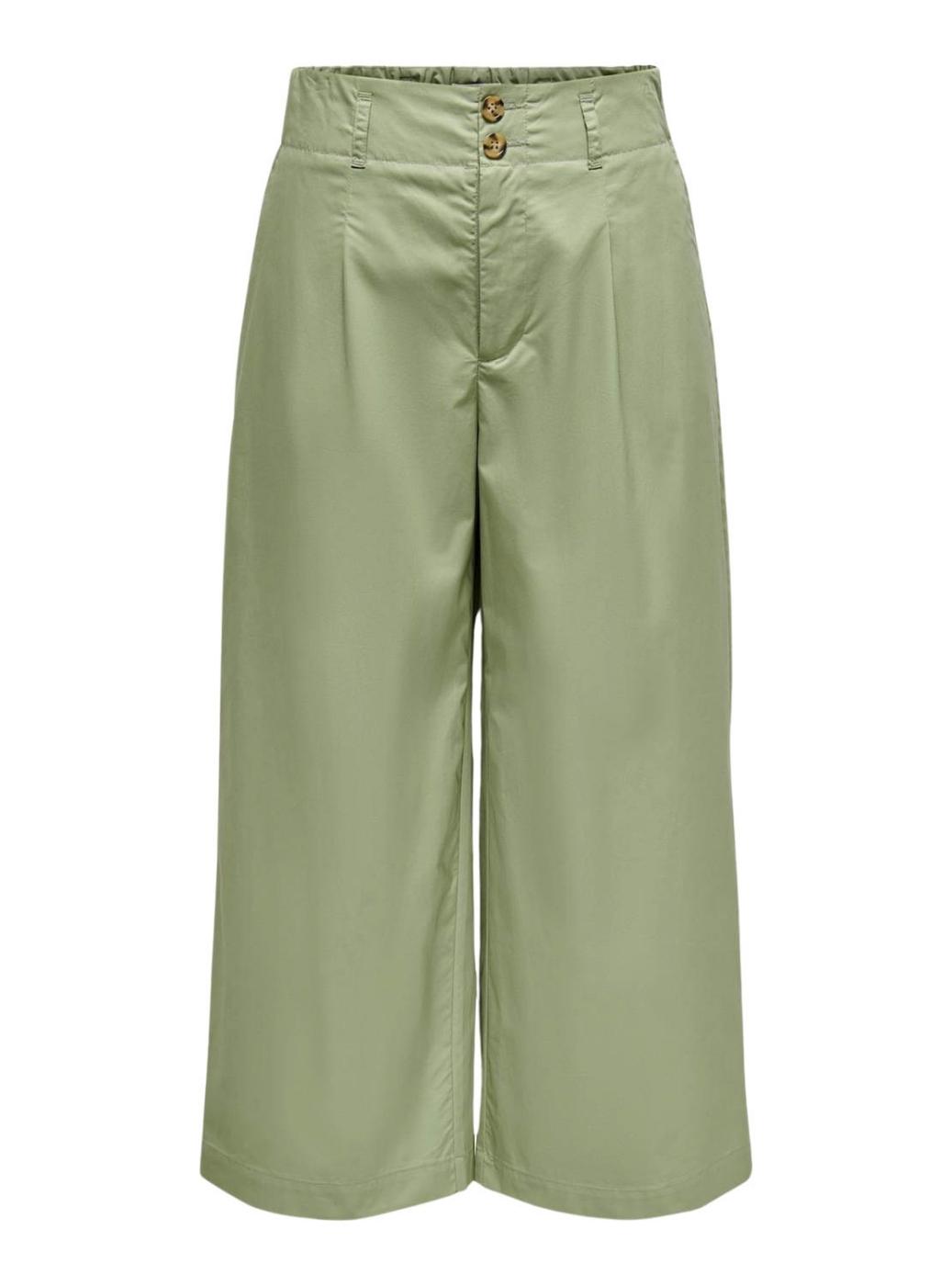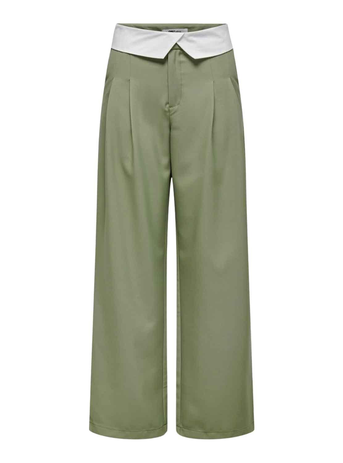 Calças Only. Cor azul. Tecido leve. Formato comprido. Cintura alta com elástico. Corte folgado. Perna larga. Bolsos laterais. O modelo veste o tamanho S.