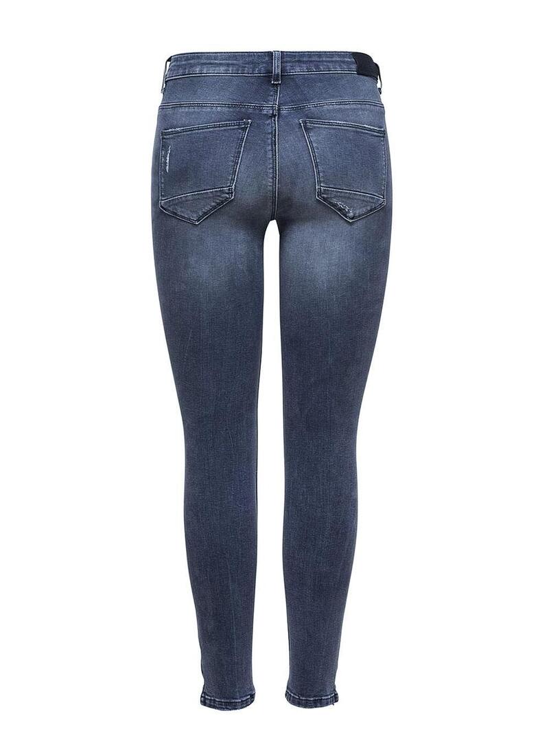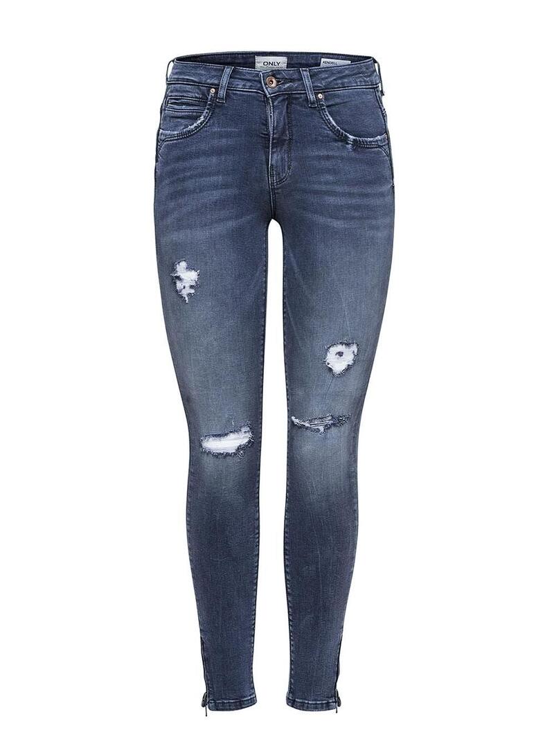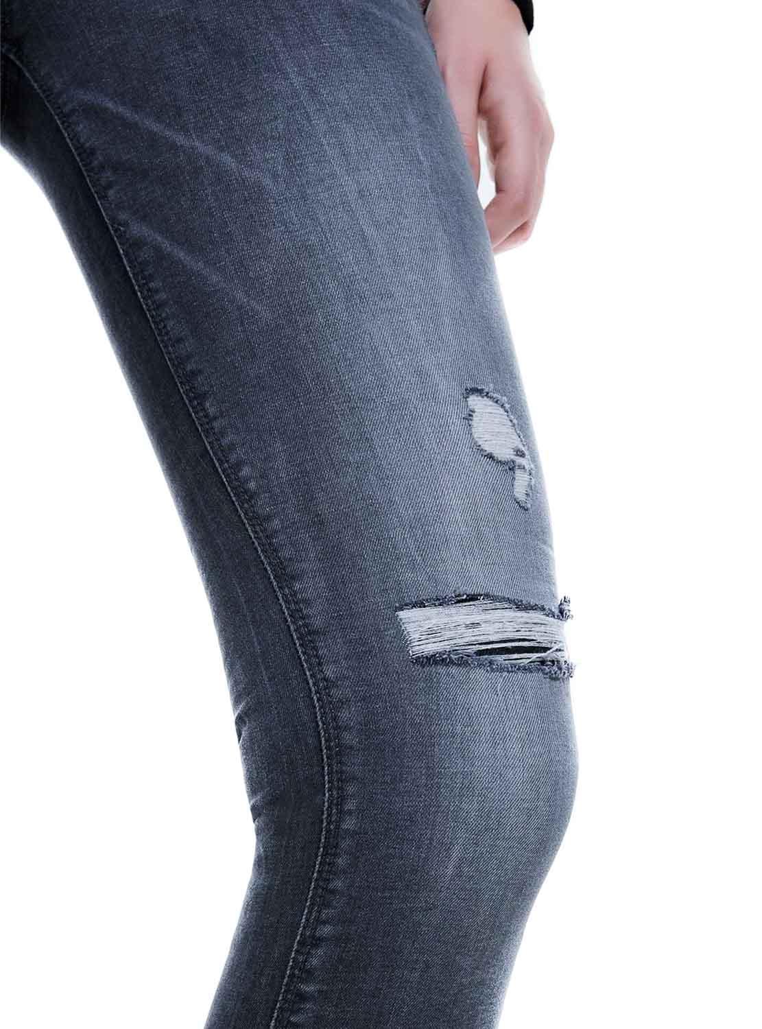 Jeans Modelo Kendell CRE1885. Cor cinzenta. Skinny. Tiro normal. 5 bolsos. Formato curto. Zip detalhe na bainha. O modelo usa tamanho 27.