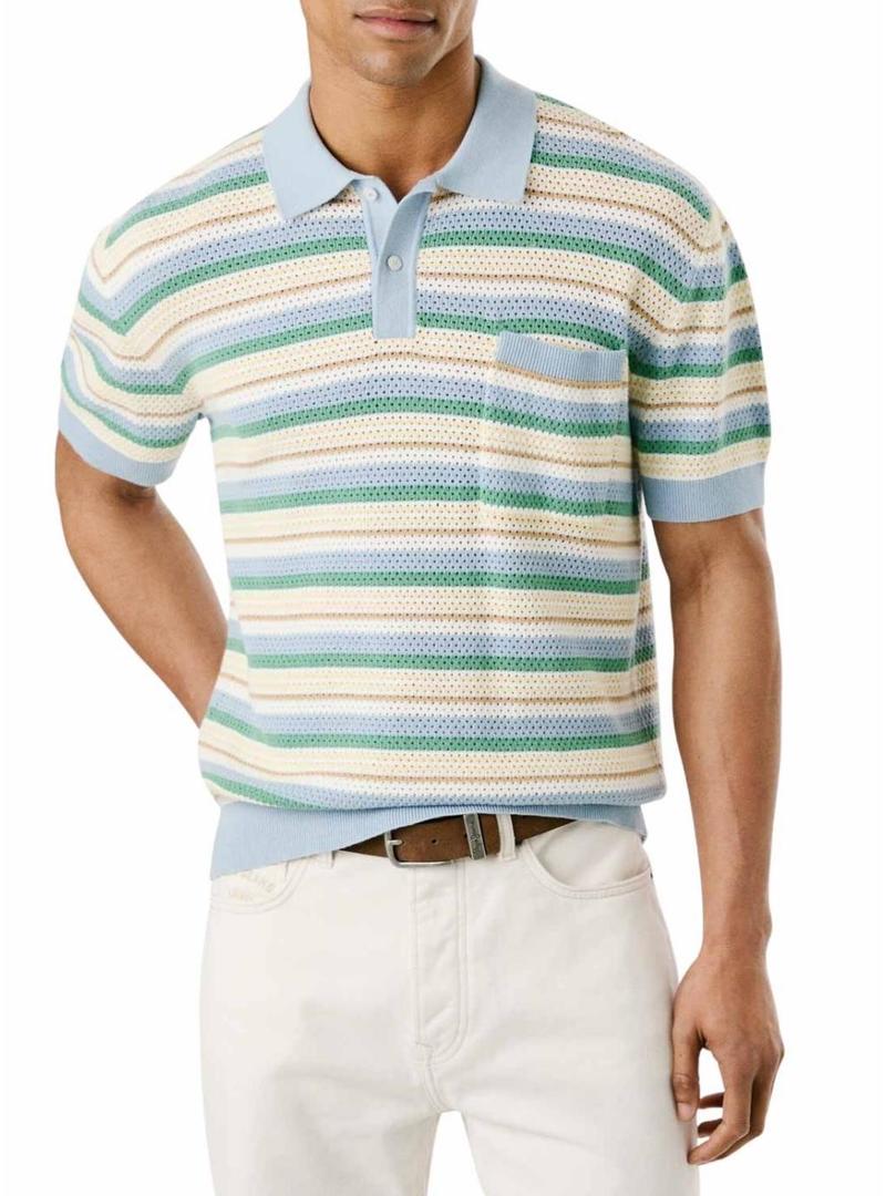 Polo Pepe Jeans. Modelo Preston. Cor azul, verde e amarelo. Estampado com listras em tons pastel. Gola com dois botões. Manga curta. Ajuste regular. Tecido de malha perfurada. Extremidades caneladas.