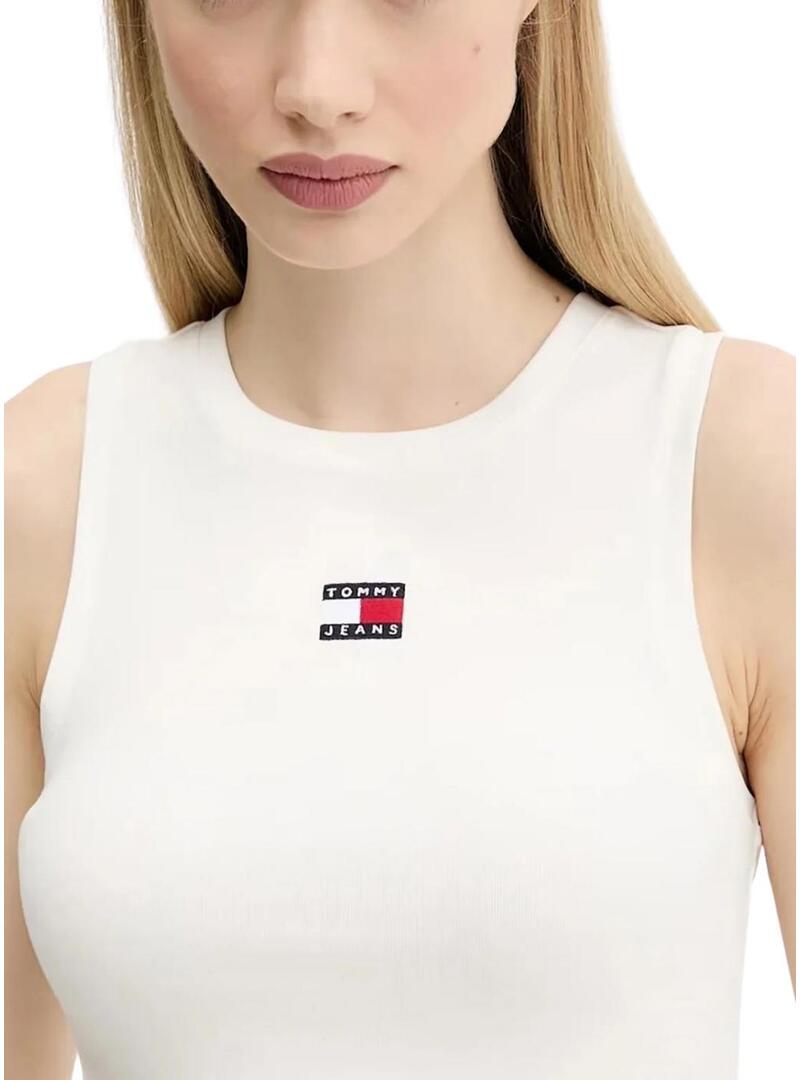 Camiseta Tommy Jeans. Modelo Script. Estilo regata. Decote redondo. Alças largas. Corte ajustado. Tecido canelado. Logo bordado no peito com fonte script. Cor branca.
