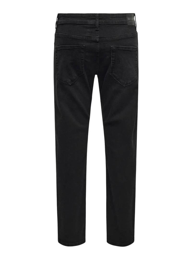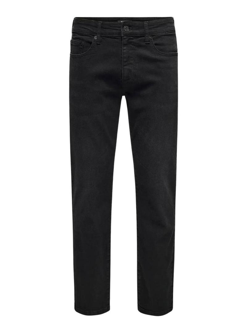 Calça jeans Only and Sons. Modelo Weft. Denim em cor preta. Patches da marca na cintura. Corte regular. Perna reta. Cinco bolsos. Fechamento com botão e zíper.