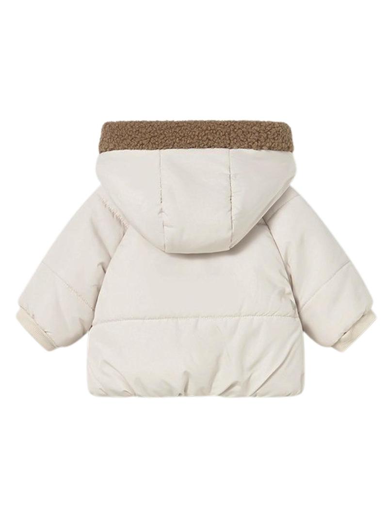 Casaco Mayoral. Cor bege. Manga comprida. Para recém-nascido. Capuz com detalhes de pelo. Fecho frontal com zíper. Exterior em tecido acolchoado. Interior com estampa de listras.