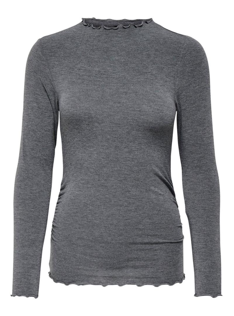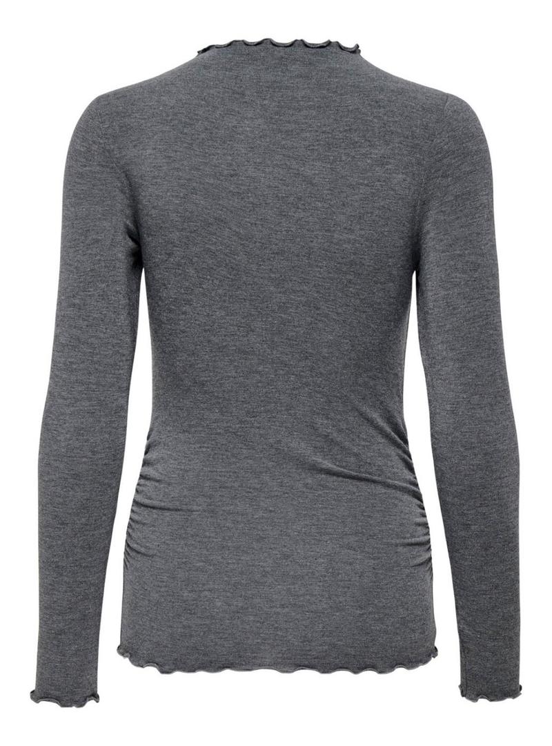 Camisola Only. Modelo Glamour. Cor cinza. Aparência mesclada. Manga comprida. Tecido elástico. Corte muito ajustado. Gola semi-rulê. Acabamentos ondulados.