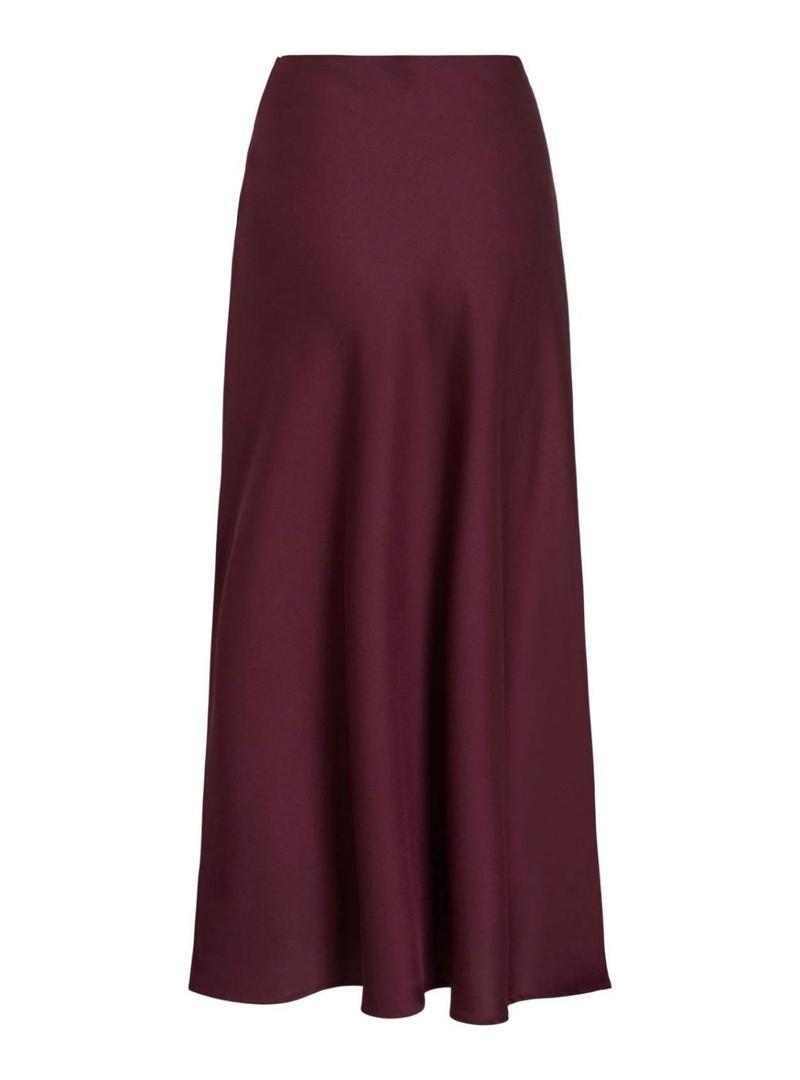Saia Vila. Modelo Viellette. Cor granate. Corte midi. Aspecto acetinado. Tecido fluido. Cintura elástica. Estilo básico.