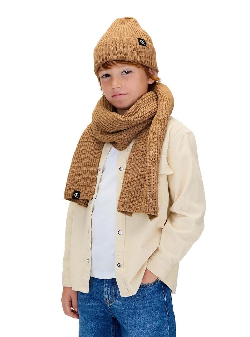Conjunto de gorro e cachecol Calvin Klein cor de camelo para crianças.