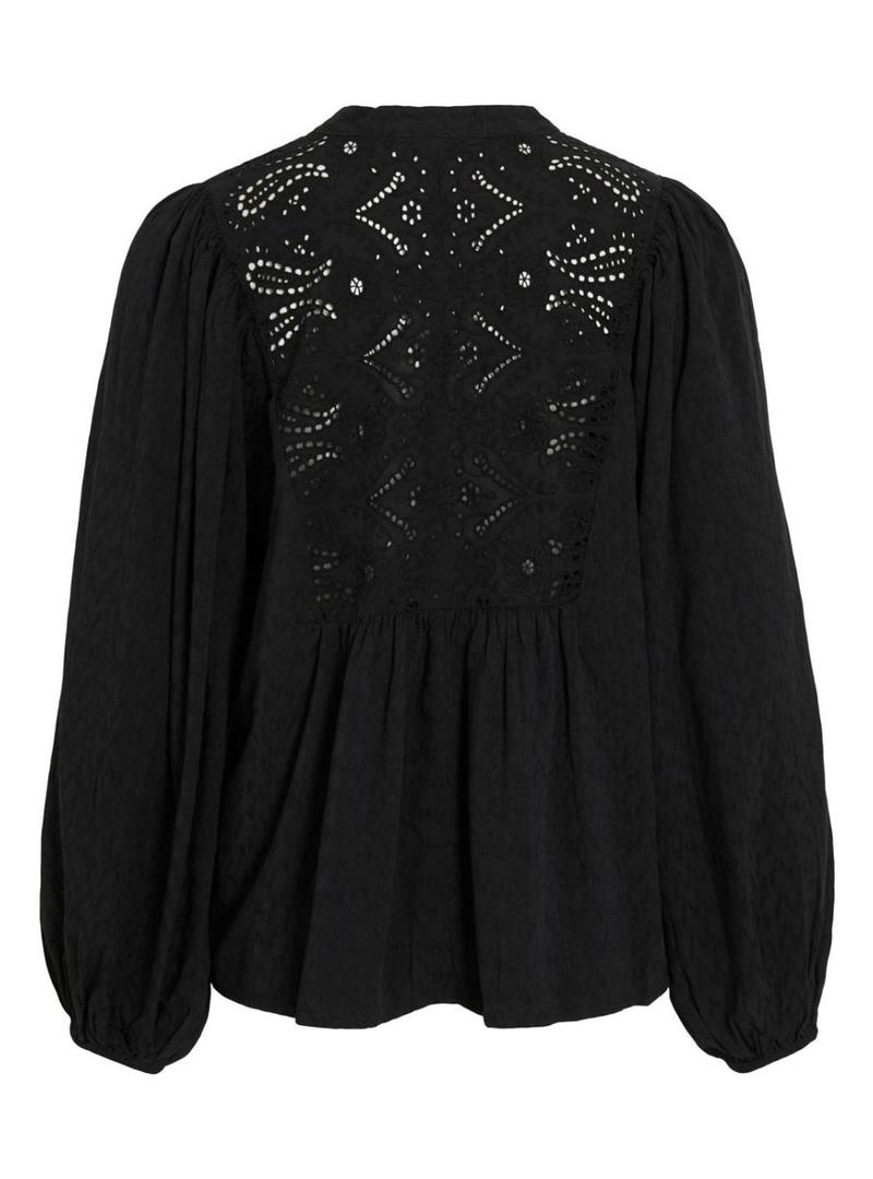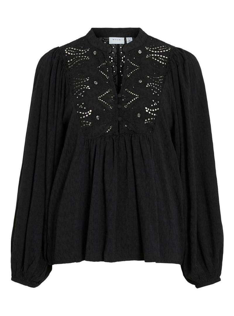 Blusa Vila. Cor preta. Decote em V. Mangas longas volumosas. Gola com botões. Detalhes transparentes no peito e nas costas. Tecido leve. Corte regular. A modelo veste o tamanho 36.