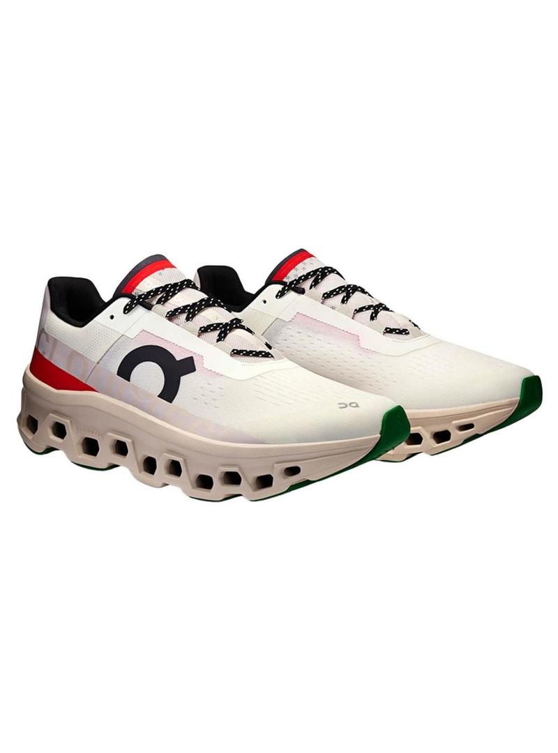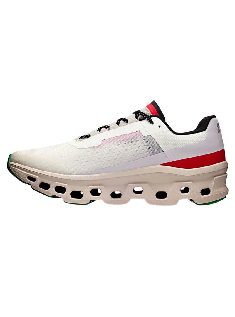 Sapatilhas On Running. Modelo Cloudmonster. Cor de fundo branco. Detalhes multicoloridos. Logotipo lateral em preto. Sapatilhas com amortecimento máximo. Palmilha e parte superior suaves para maior conforto. Ágil Speedboard. Superespuma Helion que absorve os impactos. Leves e duráveis. Peso: 230g. Tamanho regular. Palmilha CloudMonster. Sola CloudTec.