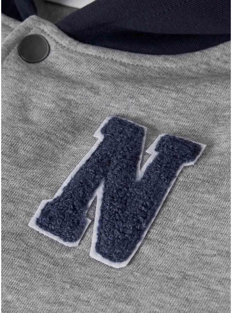 Jaqueta de pelúcia Name It. Cor cinza. Fechamento frontal com botões. Com capuz. Mangas compridas em contraste. Bolsos frontais. N de espuma em relevo no peito. Bordados decorativos. Formato regular.