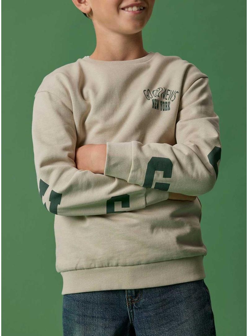 Moletom Name It. Cor bege. Gola redonda. Manga comprida. Texto estampado no peito. Grande estampa na parte de trás. Corte regular. Ombros caídos.