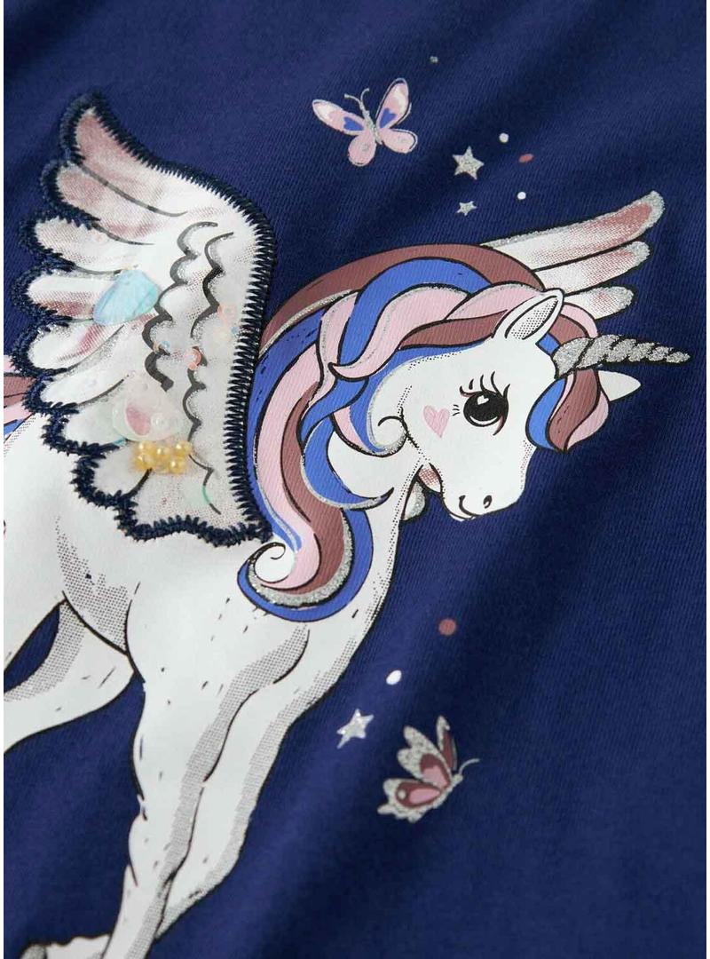 Camiseta Name It. Cor marinho. Manga comprida. Unicórnio estampado no peito. Formato regular.