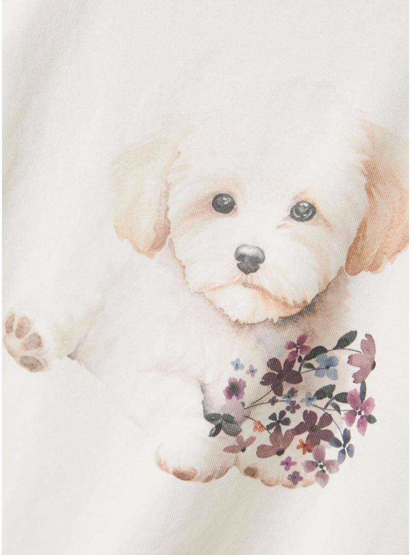 Camiseta Name It. Cor branca. Manga comprida. Cão estampado na parte da frente. Mangas bufantes. Corte regular.