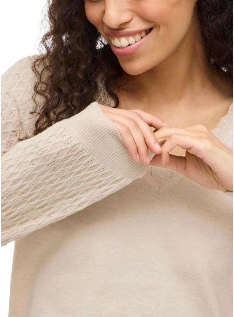 Camisola Vila. Cor bege. Tecido de malha ponto ajour. Decote em V. Bainha canelada. Manga comprida. Corte regular. Malha macia e elástica. A modelo está a usar o tamanho S.