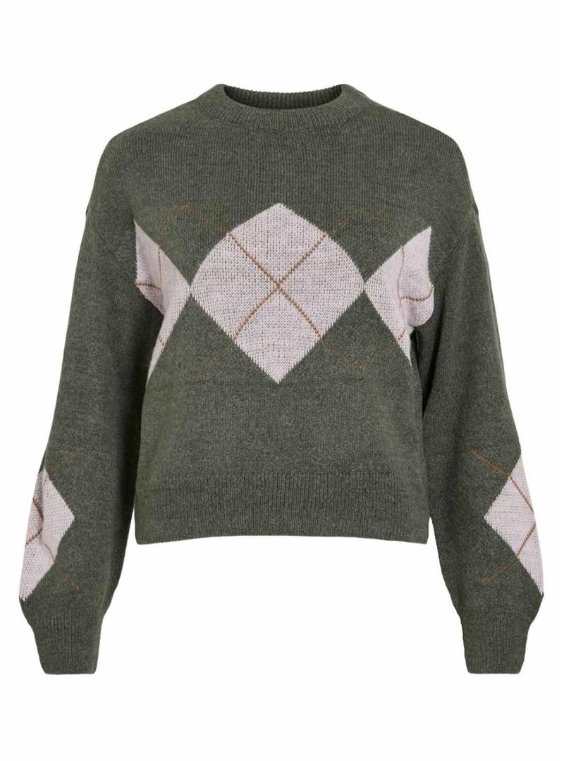 Camisola da Vila. Cor verde. Estampa de losangos. Gola redonda. Manga comprida bufante. Ombros caídos. Ajuste regular. Acabamentos canelados. O modelo está a usar o tamanho S.