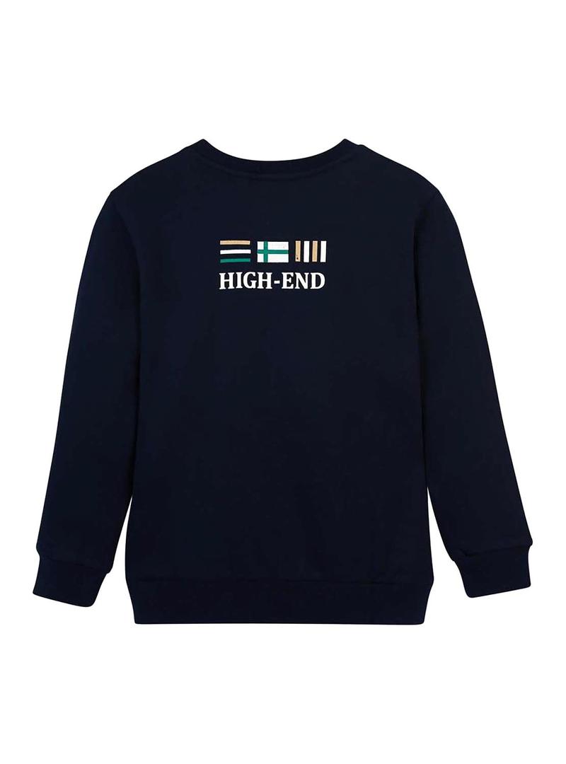 Sweat Mayoral. Cor marinha. Manga comprida. Pescoço redondo. Tecido de pelúcia grosso e quente. Bolsos frontais. Logotipo e desenho de impressão.