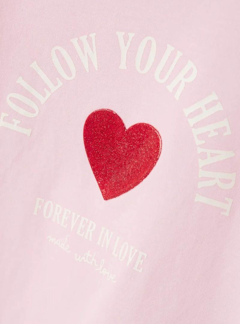 Camiseta Name It. Cor de rosa. Manga comprida. Gola redonda. Estampado na frente. Detalhe de coração em contraste.