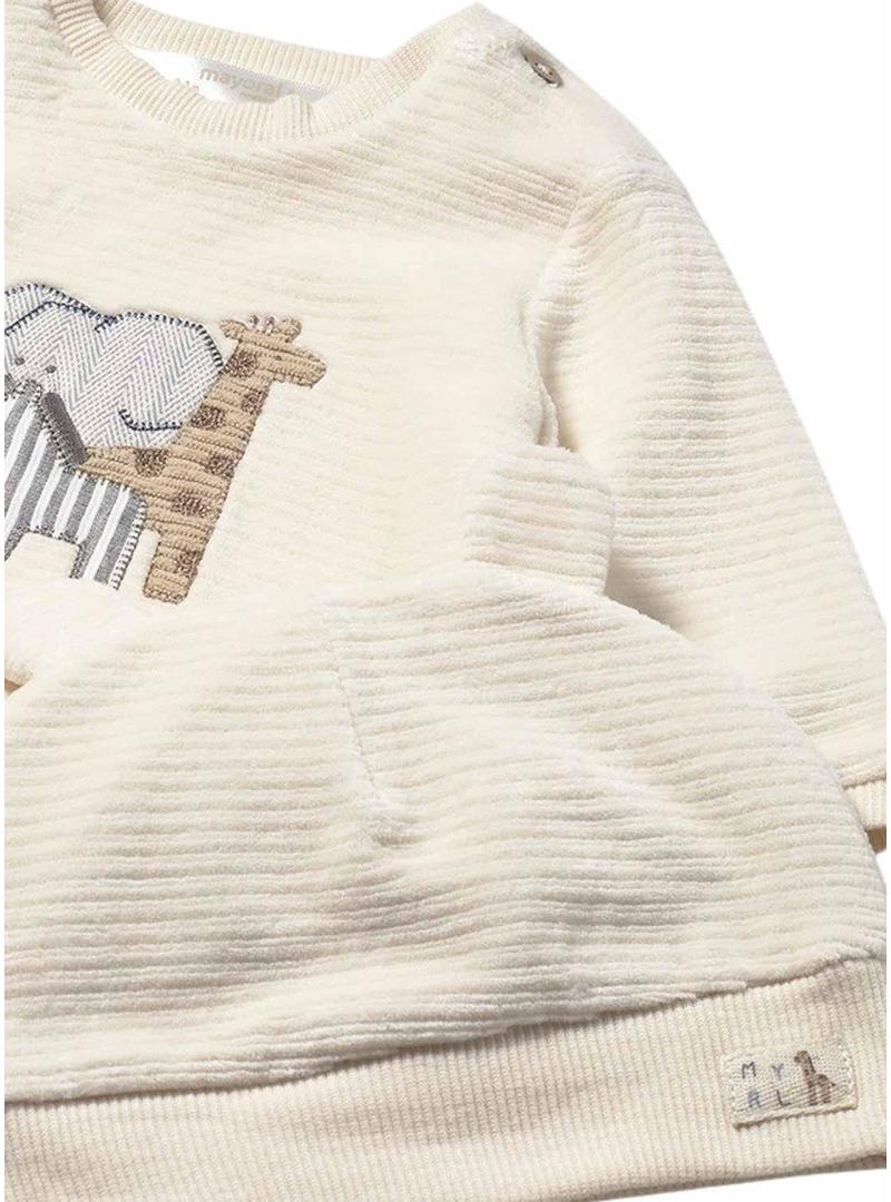 Conjunto de fato Mayoral. Cor bege. 3 peças. Tecido de malha de veludo cotelê. Moletom de manga comprida. Gola redonda. Estampa bordada na parte da frente. Calça comprida. Cintura elástica. Com bolsos. Gorro com orelhinhas.