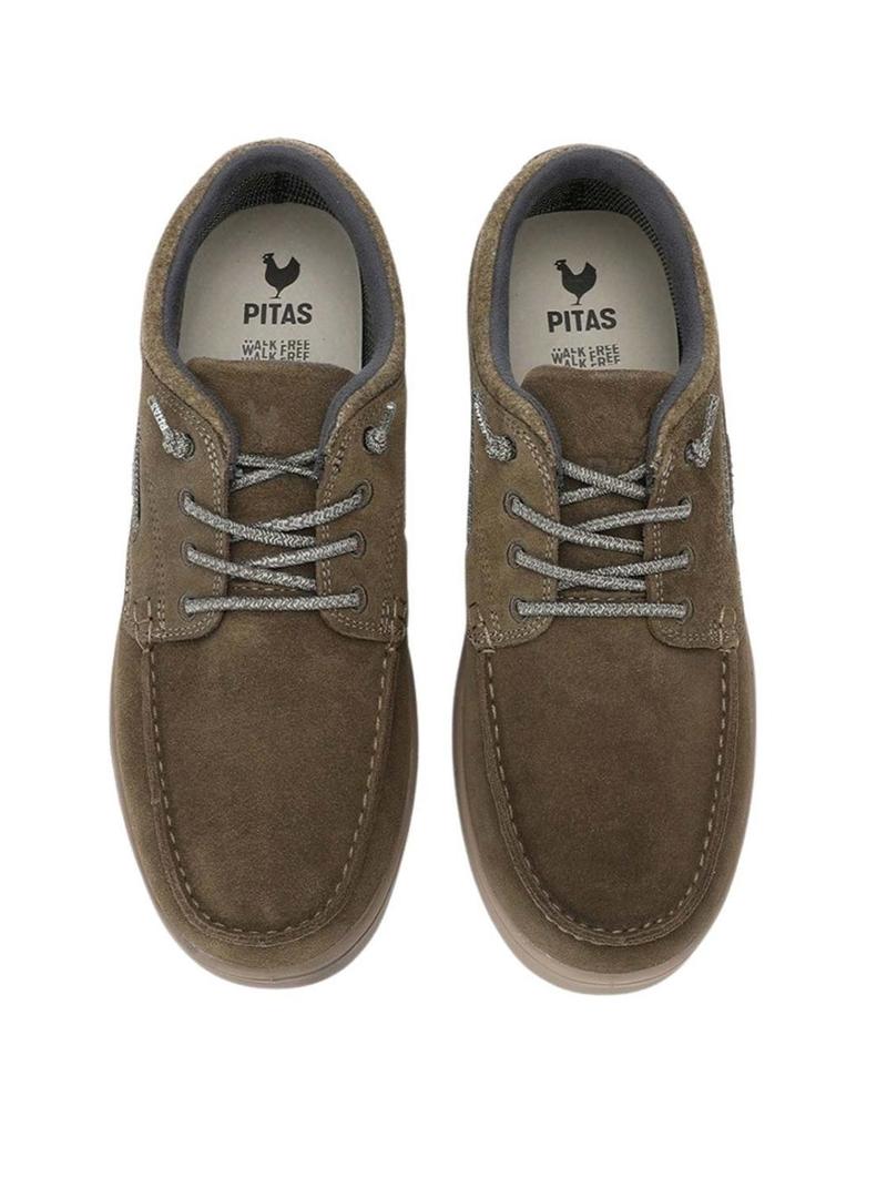 Sapatos Walkin Pitas. Modelo Dakota. Fecho com cadarço. Cor verde. Estilo náutico. Sola de EVA ultraleve e sola de borracha antiderrapante. Etiqueta lateral. Camurça hidrofugada. Forro têxtil com membrana Pitas Tex. Palmilha removível.