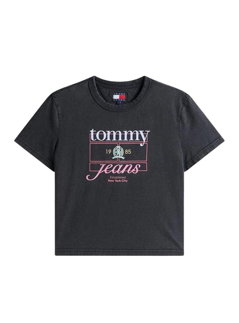 Camiseta Tommy Jeans. Modelo Crest Flag. Cor preto. Efeito lavado. Gola redonda. Manga curta. Ajuste quadrado. Comprimento cropped. Logo estampado na frente.