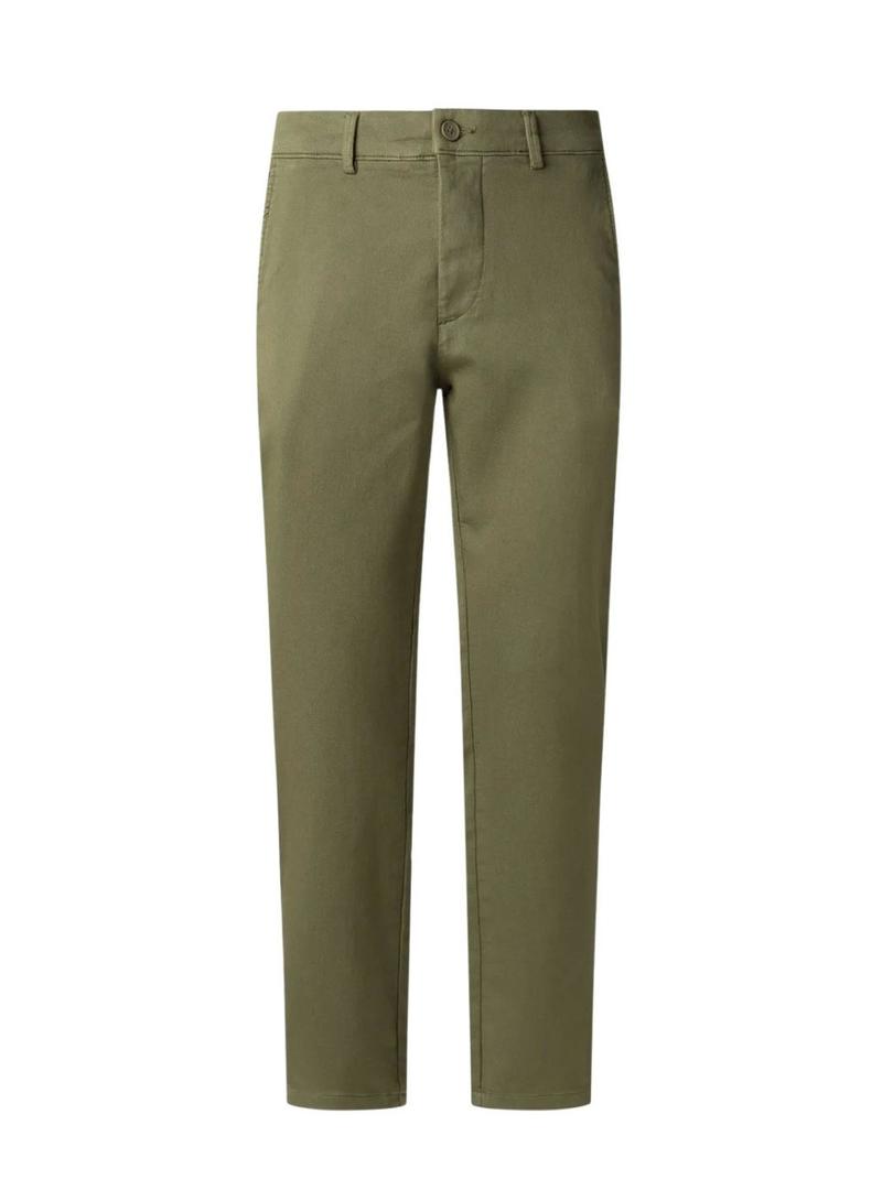 Calça Pepe Jeans. Formato chinês. Cor verde. Tecido gymdigo. Perna slim. Bolsos laterais. Passadores para cinto. Bolsos traseiros com botão. Etiqueta com logotipo acima do bolso traseiro.