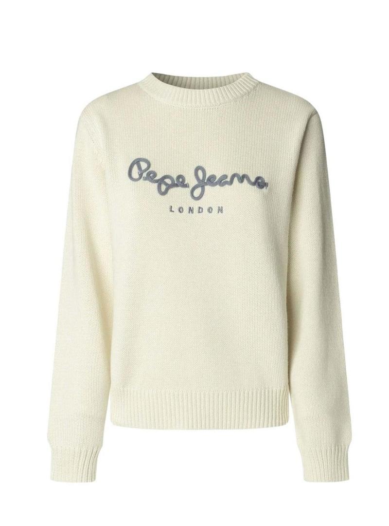 Camisola Pepe Jeans. Cor bege. Tecido de malha. Manga comprida. Gola redonda. Ombros levemente caídos. Logo Pepe Jeans em relevo na parte da frente. Acabamentos canelados.