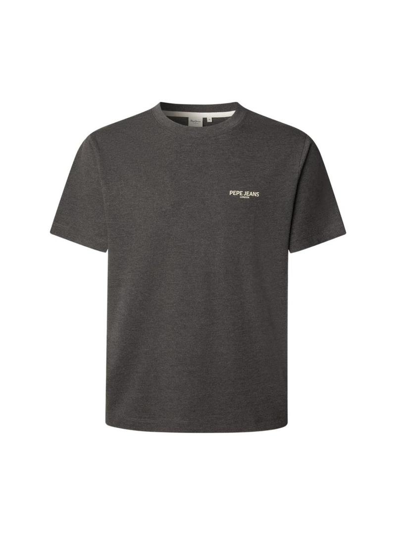Camiseta Pepe Jeans. Cor cinza. Manga curta. Gola redonda. Corte relaxado. Logo no peito. Estampa gráfica nas costas. O modelo veste tamanho M.