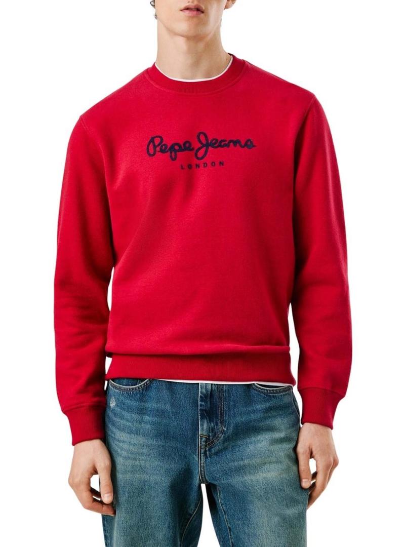 Blusa com capuz da Pepe Jeans. Cor vermelha. Manga comprida. Gola redonda canelada. Logo da Pepe Jeans em azul-marinho no peito. Corte regular. Acabamentos canelados. O modelo está usando o tamanho M.