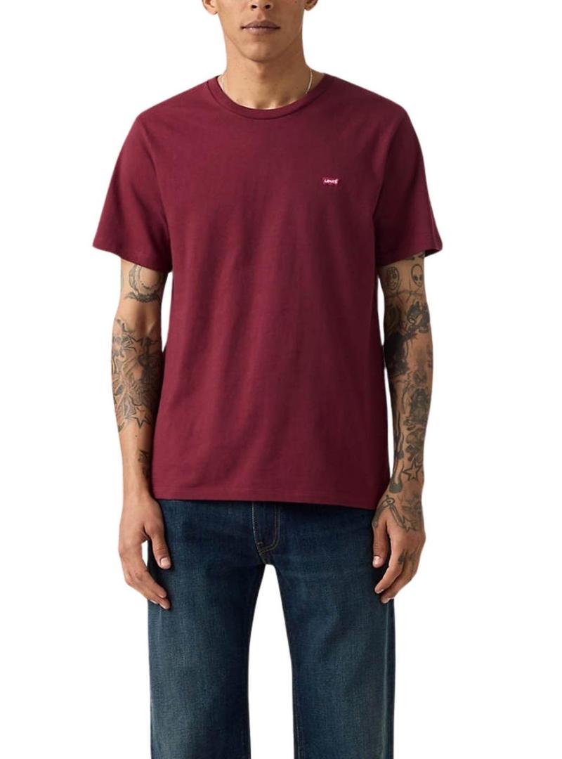 Camiseta Levis. Modelo básico. Cor granada. Gola redonda canelada. Manga curta. Logotipo no peito. Corte padrão. O modelo veste tamanho M.