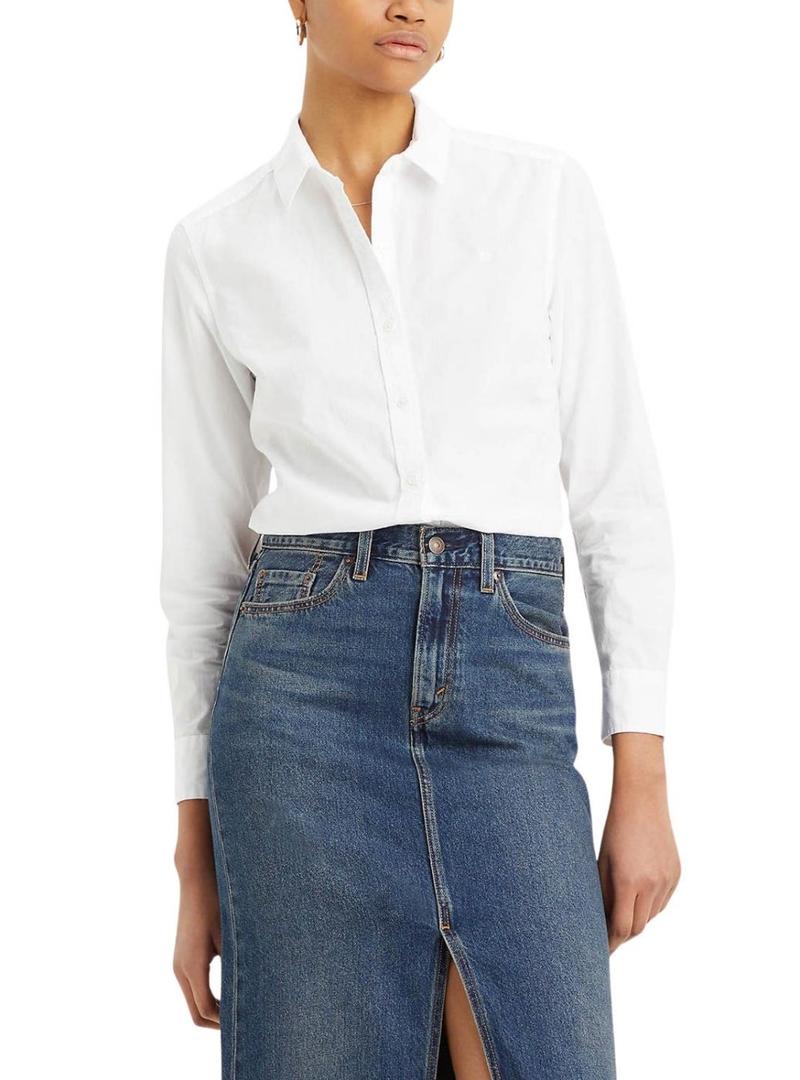 Camisa Levis. Cor branca. Tecido Oxford. Manga comprida. Logotipo bordado em tom no peito. Ajuste padrão. A modelo veste o tamanho S.