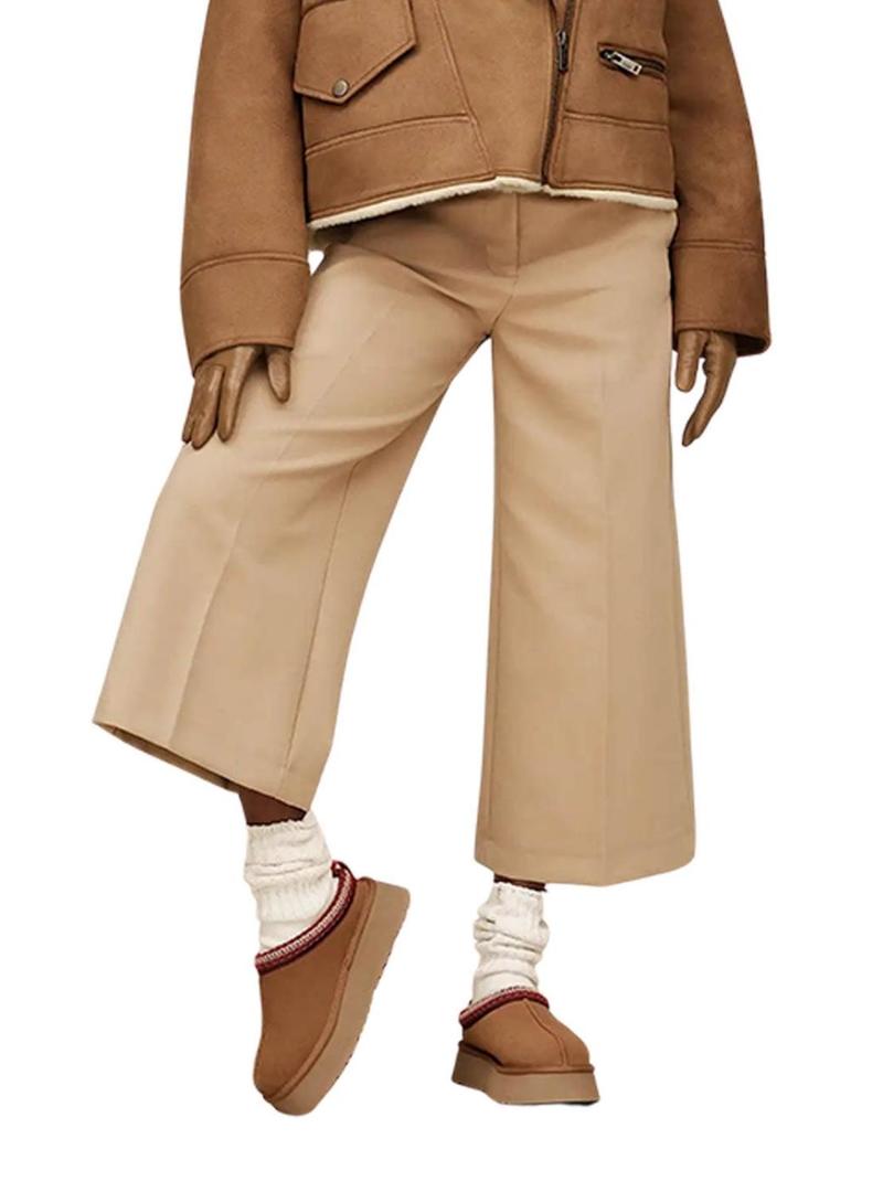 Tamancos UGG. Modelo Tazz II. Cor camel. Sem calcanhar. Parte superior em camurça macia. Detalhe trançado UGGbraid de poliéster 100% reciclado. Forro e palmilha de pele de carneiro de 10 mm para maior calor e conforto. Sola leve de EVA SugarSole feita de cana-de-açúcar com formato de balancim. Plataforma de 4,4 cm. Acabamento em tecido de poliéster 100% reciclado. Logotipo UGG termogavado.