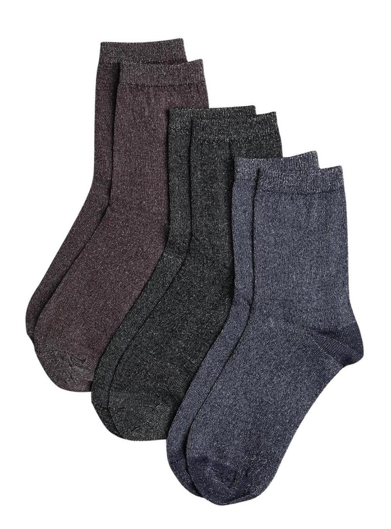 Pacote de 3 pares de meias da Pieces. Modelo Shirley. Três cores: bordô, preto e azul-marinho. Detalhe de fibras metálicas. Ponta e calcanhar reforçados. Punhos canelados.